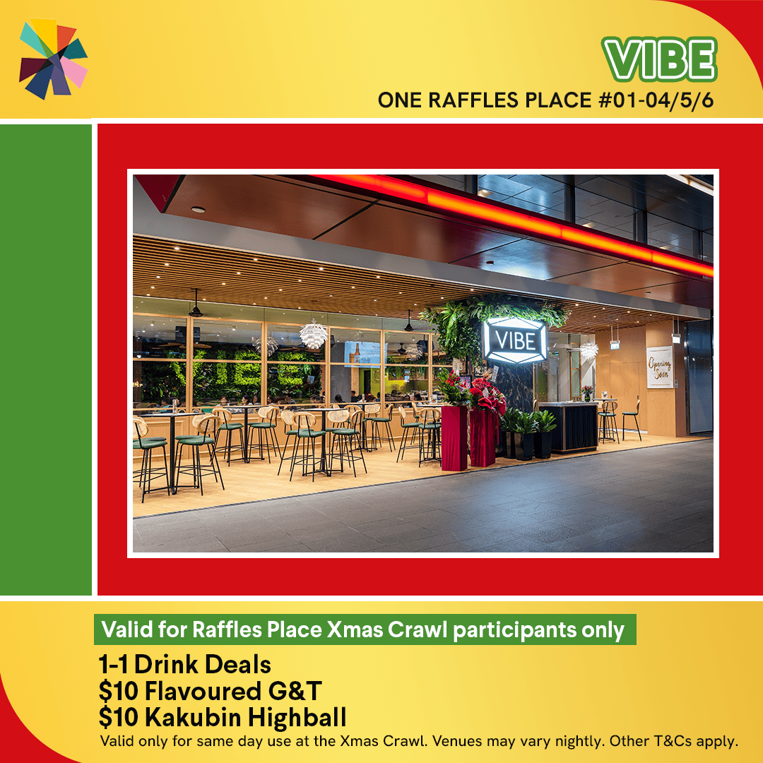 Located right by Raffles Place Park, VIBE at One Raffles Place is a well situated bistro to stop by after work for food and drinks, be it on the way home or whilst gearing up for a night of revelry. With indoor and al fresco seating options, indulge in locally inspired, sustainably sourced dishes alongside timeless beverages.