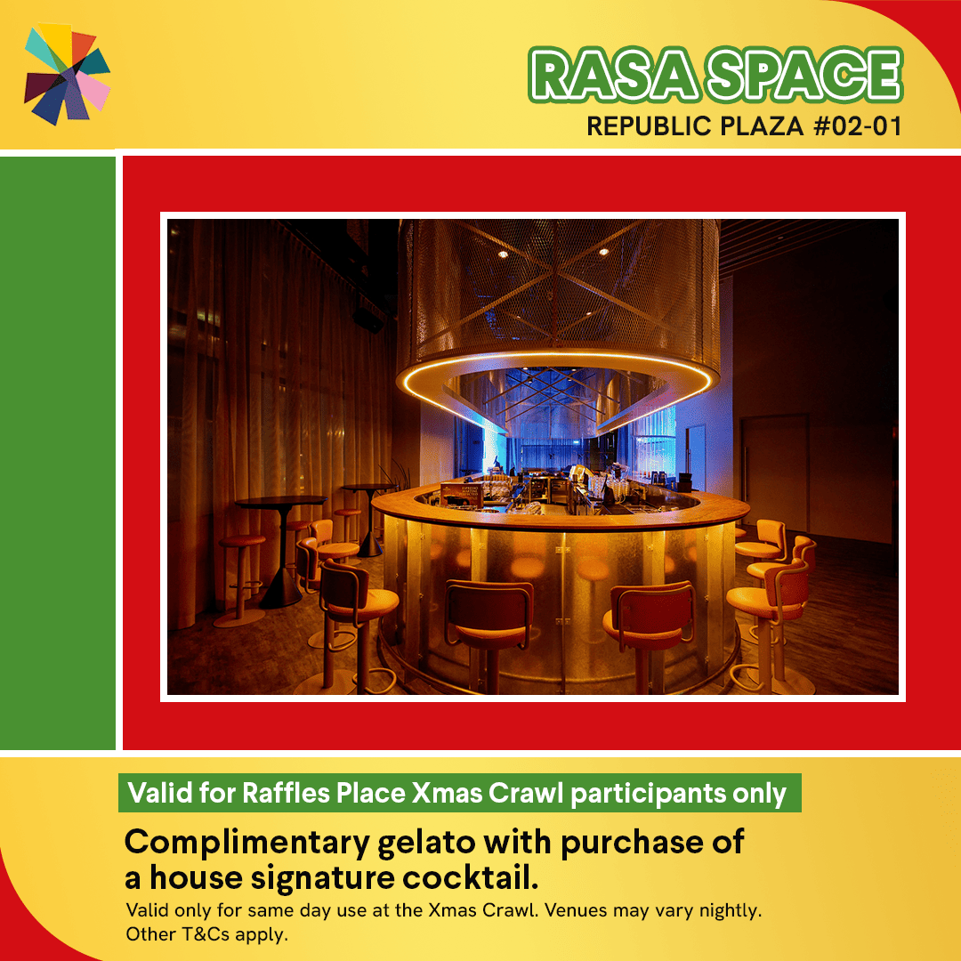 Immerse yourself in a world of music, arts, dance and culture at Republic Plaza’s RASA Space! Step into this chic restaurant-lounge, which opens up into a pulsing dance floor at night—-a great place to create lasting memories with your favourite people!