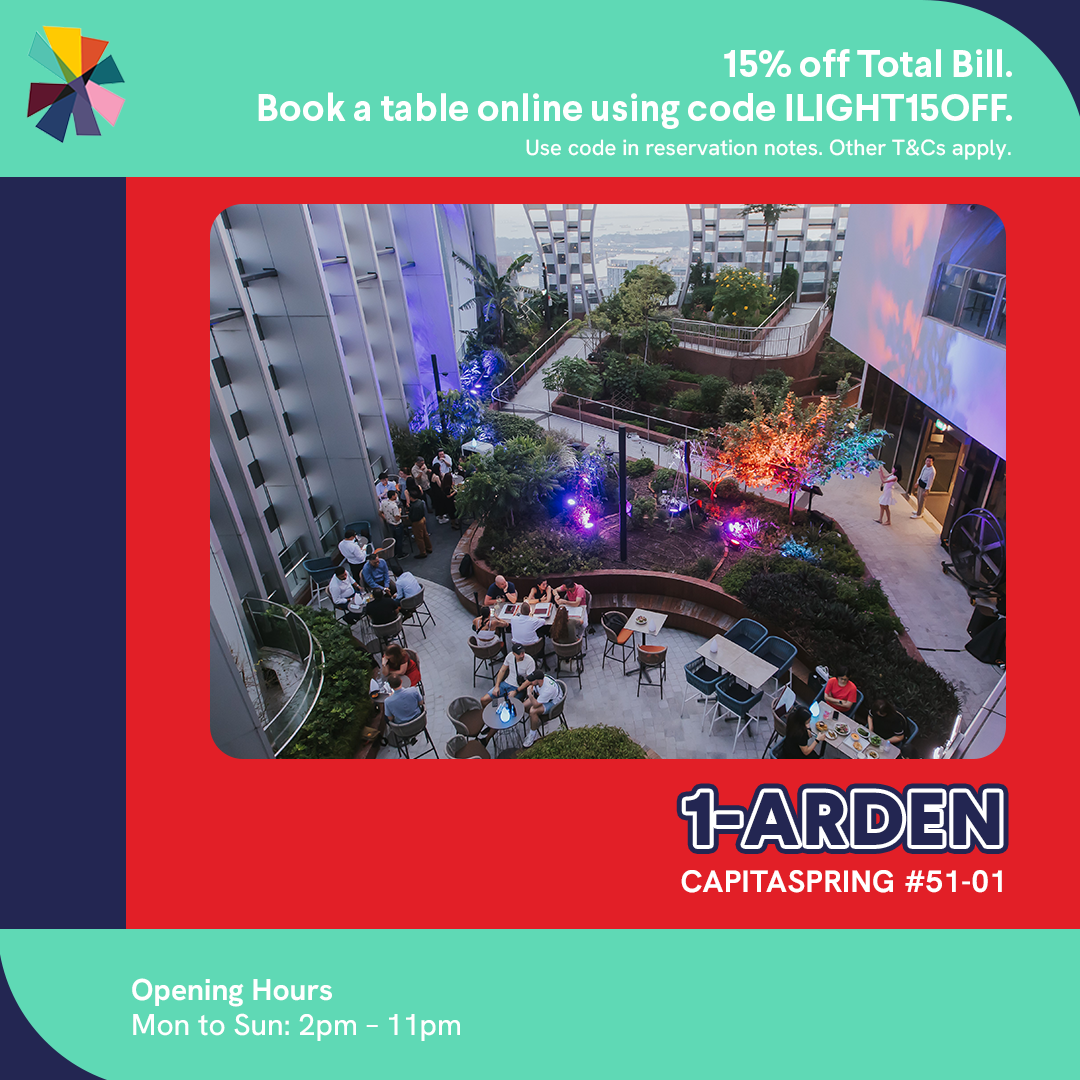 As the light installations turn on at 7:30pm, soak in the view of the whole city from up above! Dine sky-high and relish the cityscape atop CapitaSpring. Book a table at 1-Arden using promo code ILIGHT15OFF to get 15% off your total bill at 1-Arden Rooftop Bar, Oumi. Sol & Luna, and Kaarla Wood-Fire Grill & Bar.