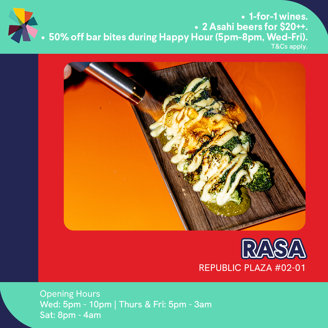 While the night is still young, experience the buzz of Republic Plaza at RASA or Social Bar & Bistro. Gather your colleagues, check out the installations and clink your drinking glasses to great deals on wines, beers and spirits.