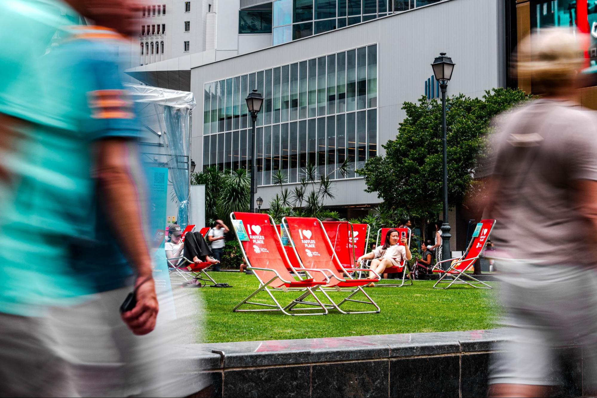 Clad in a striking red hue, each of the chairs placed in the park features a customised one-of-a-kind print, emblazoned with the words: “I ❤ Raffles Place”.