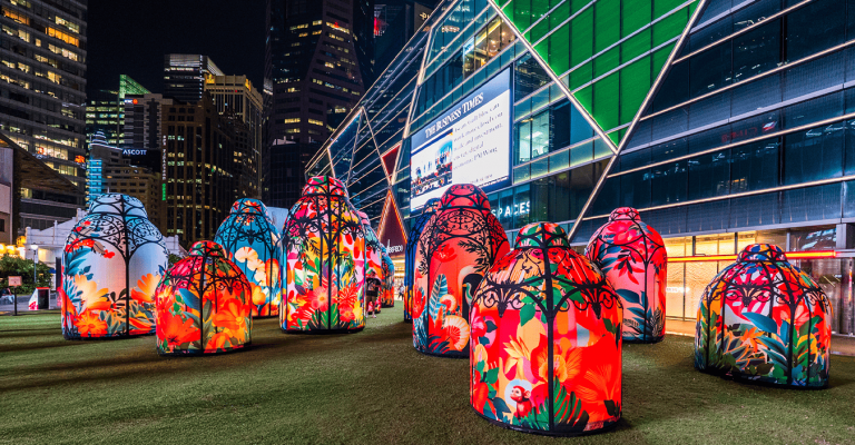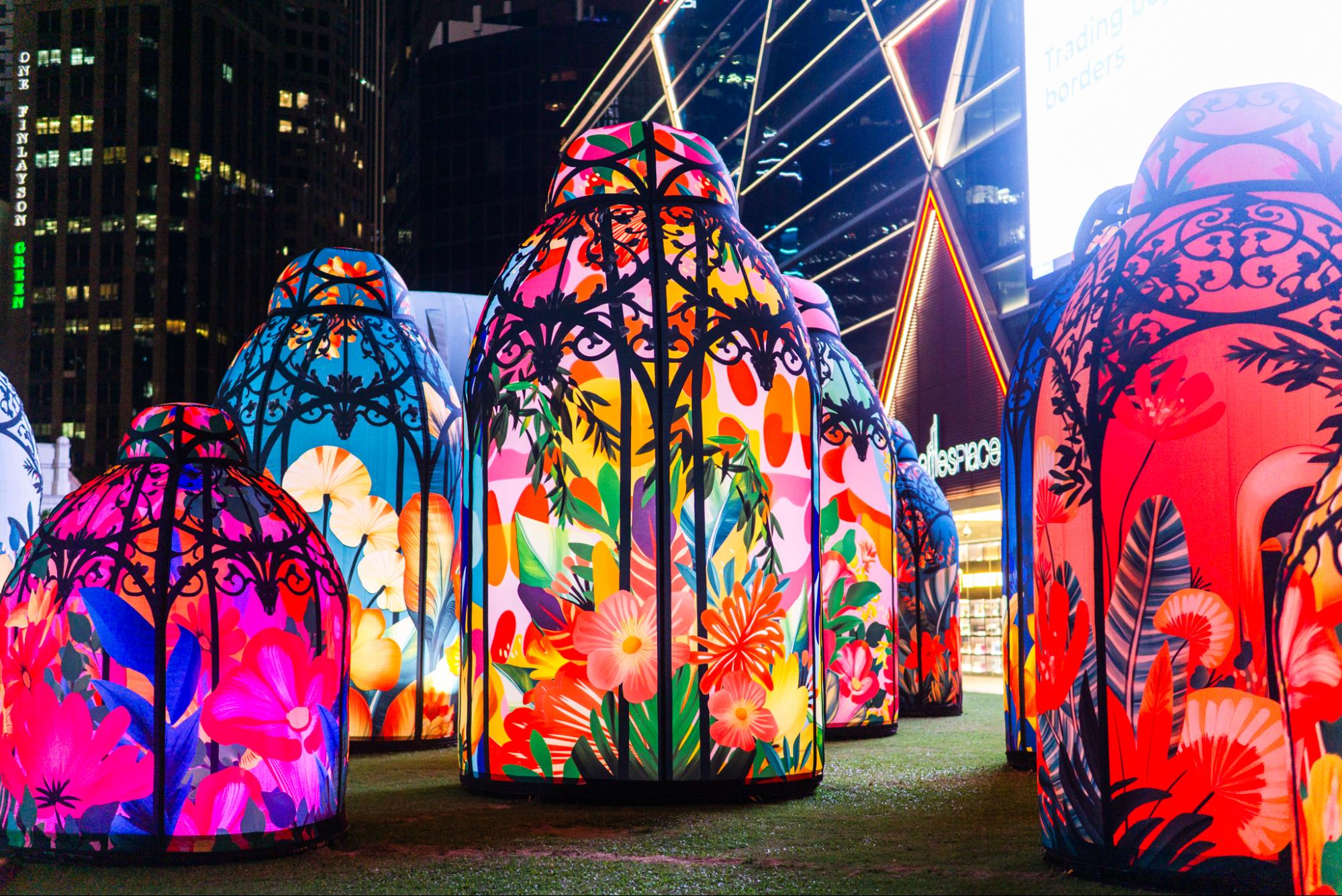 Sixteen inflatable artworks designed by Australian artist Matthew Aberline and The Beautiful and Useful Studio were planted within Raffles Place Park to form a garden-like landscape. Vibrant by day and luminous by night, the colourful structures shaped like gazebos, glasshouses and bird cages were each ornately decorated with the native flora and fauna unique to Singapore.
