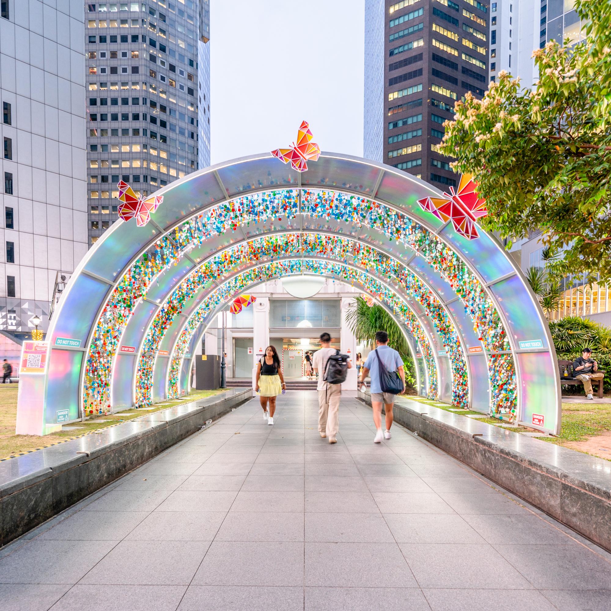 This year’s décor featured festive arches, boxes of good fortune and a striking archway adorned with over 20,000 shimmering sequins. Enhancing these displays were geometric butterflies in bright orange, pink, and yellow hues—symbolising the arrival of spring and serving as lucky charms for visitors to Raffles Place.