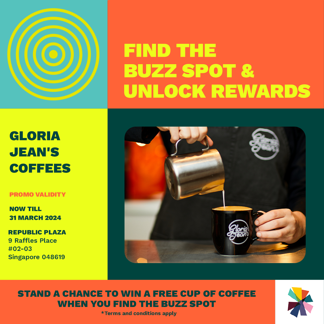To play, scan the QR code. Simply match three Buzz Marks in record time and score a free cup of coffee from Gloria Jeans Coffees at Republic Plaza or other prizes when you play successfully!